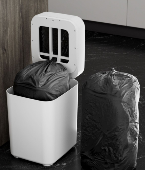 Motion sensor opens. Bag auto-seals and replaces. Never breaking stride.